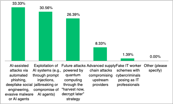 AI-assisted attacks (33%) were respondents’ top concern, but just behind that on the list of worries was exploitation of AI systems (31%). Quantum security (26%) emerged as the other main concern, as security staff prepare for the day the technology will be able to break modern encryption.