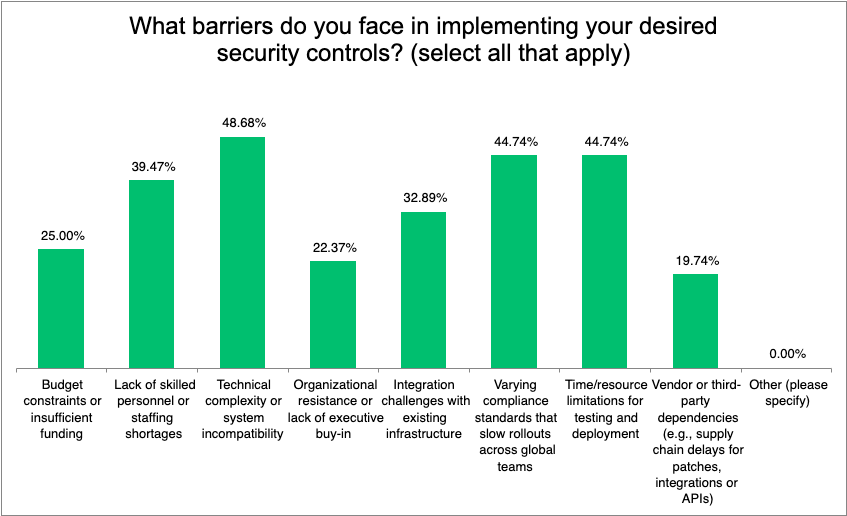 The biggest impediments to security implementations had to do with technical complexity or system incompatibility (49%), limitations in time and resources for testing and deployment (45%) and varying compliance standards across global teams. Lack of skilled personnel or staffing shortages were also commonly cited impediments.